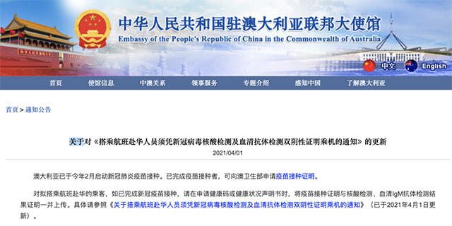 移投界讯:昨天,中国驻澳大使馆更新了一则通知!是关于在澳搭乘航班回国的新规定——对于已经在澳接种疫苗的小伙伴,搭乘回国航班时在申请健康码之前,需要上传自己的疫苗接种证明。内容如下: