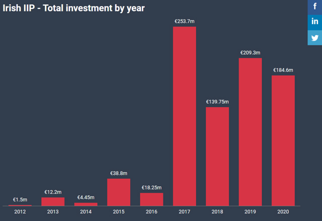 自2012年爱尔兰投资居留计划项目推出以来,每年通过IIP募集的金额如下表: