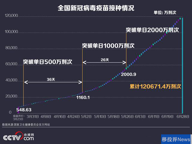 移投界讯:国家卫生健康委员会官网昨天(6月29日)通报,截至2021年6月28日,31个省(自治区、直辖市)和新疆生产建设兵团累计报告接种新冠病毒疫苗120671.4万剂次,本轮接种1亿剂次新冠疫苗仅用时4天,刷新纪录。我国正向构筑坚实免疫屏障的目标加速迈进。