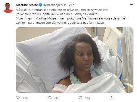 在遇刺事件中深受重伤的海地第一夫人马蒂娜也于15日再次发声,她发文感谢医护人员协助她坚持下来,并首度公开自己遇袭后的照片。