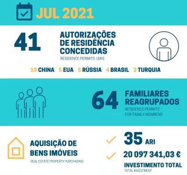 根据外国人和边境服务局(SEF)的数据,上个月颁发了41份黄金居留 ARI,其中 35 个为购买房产(11个为城市复兴房产)和 6 个通过资本转移获得。7月份购买的房地产共计投资约2000万欧元,其中390万欧元用于城市复兴工程,而资本转移共计210万欧元。