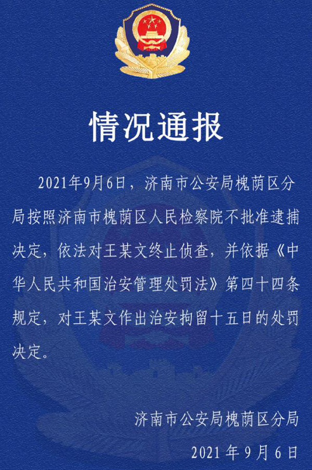 移投界讯:9月6日,济南市公安局槐荫区分局按照济南市槐荫区人民检察院经依法审查,犯罪嫌疑人王某文实施的强制猥亵行为不构成犯罪,不批准逮捕。随后,济南市公安局槐荫区分局发布通报称,按照济南市槐荫区人民检察院不批准速捕决定,依法对王某文终止侦查,并依据《中华人民共和国治安管理处罚法》第四十四条规定,对王某文作出治安拘留十五日的处罚決定。