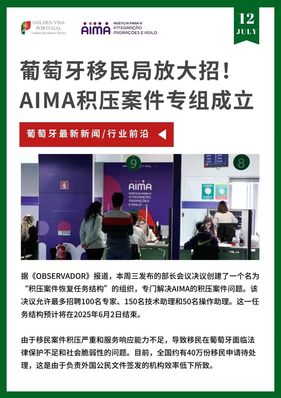 移投界讯:据《OBSERVADOR》报道,本周三发布的部长会议决议创建了一个名为“积压案件恢复任务结构”的组织,专门解决AIMA的积压案件问题。该决议允许最多招聘100名专家、150名技术助理和50名操作助理。这一任务结构预计将在2025年6月2日结束。