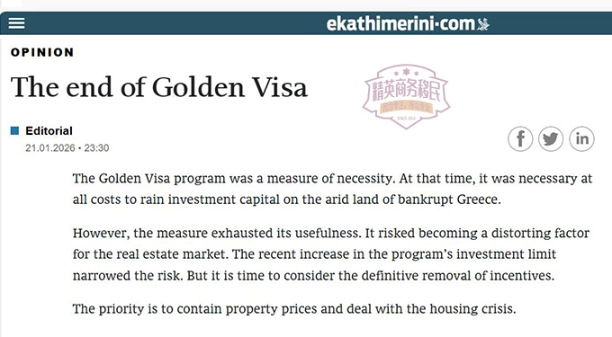 移投界讯:重磅信号来袭!希腊权威媒体《每日报》明确释放消息,希腊政府已将 “遏制房价飙升、缓解住房危机” 列为国家优先事项,而作为推高当地房价的重要因素,希腊黄金签证计划或将退出历史舞台,这不是欧洲移民的终点,而是低门槛获取欧盟国家长期居留身份的 “终点”,现阶段就是锁定低门槛入场资格的最后窗口期,无需纠结 “政策是否延期”,移民从来都是 “先到先得”,窗口期的最后阶段,每犹豫一天,就多一分遗憾。